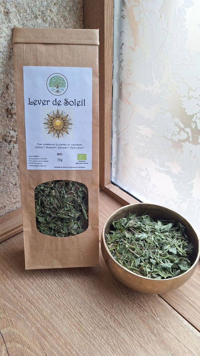 Lever de Soleil est une infusion lumineuse et délicatement aromatique, pensée pour accompagner les réveils en douceur. Son assemblage de Mélisse, Romarin, Sarriette et Thym citron offre une tasse fraîche, citronnée et subtilement tonique. Une infusion idéale pour commencer la journée avec clarté, calme et énergie douce.