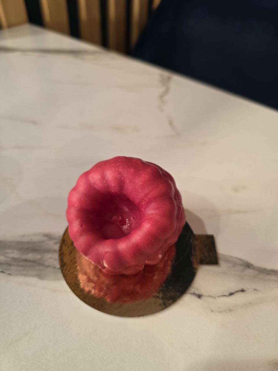Le tout est enrobé d’une fine couche de chocolat blanc coloré en rouge, apportant douceur et élégance à cette création fraîche et acidulée, parfaite pour les amateurs de framboise.