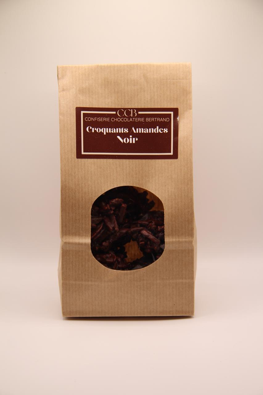 Ingrédients : Chocolat de couverture noir 67% (Pâte de cacao Sucre, beurre de cacao, émulsifiant : lécithine de tournesol), Amandes caramélisées (Amandes, sucre, beurre).