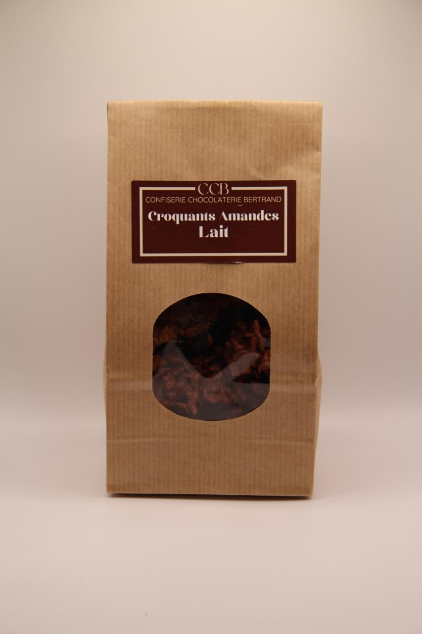 Ingrédients : Chocolat de couverture lait 41% :(Sucre, beurre de cacao, poudre de lait entier, pâte de cacao, émulsifiant : lécithine de tournesol), Amandes caramélisées (Amandes, sucre, beurre).