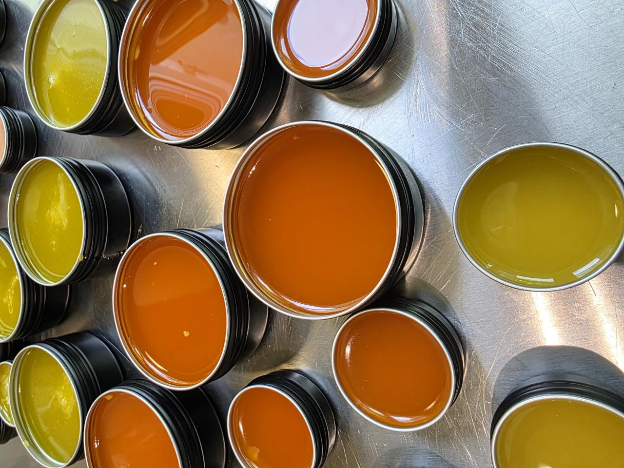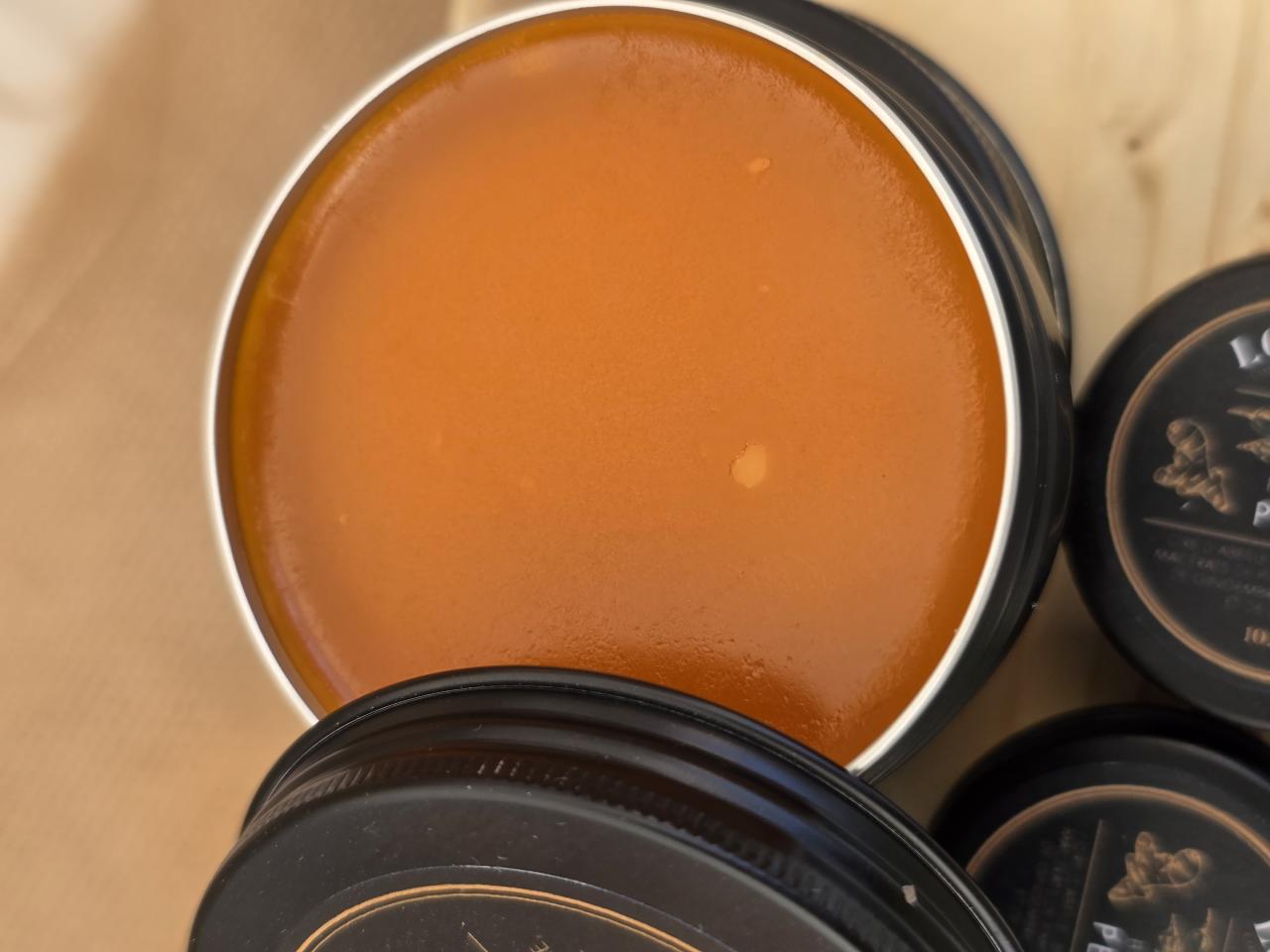Une fois les macérats prêts, ils sont chauffés au bain-marie à basse température avec de la cire d’abeille et du beurre de karité. Cette étape permet d’obtenir une texture fondante, stable et agréable à appliquer.