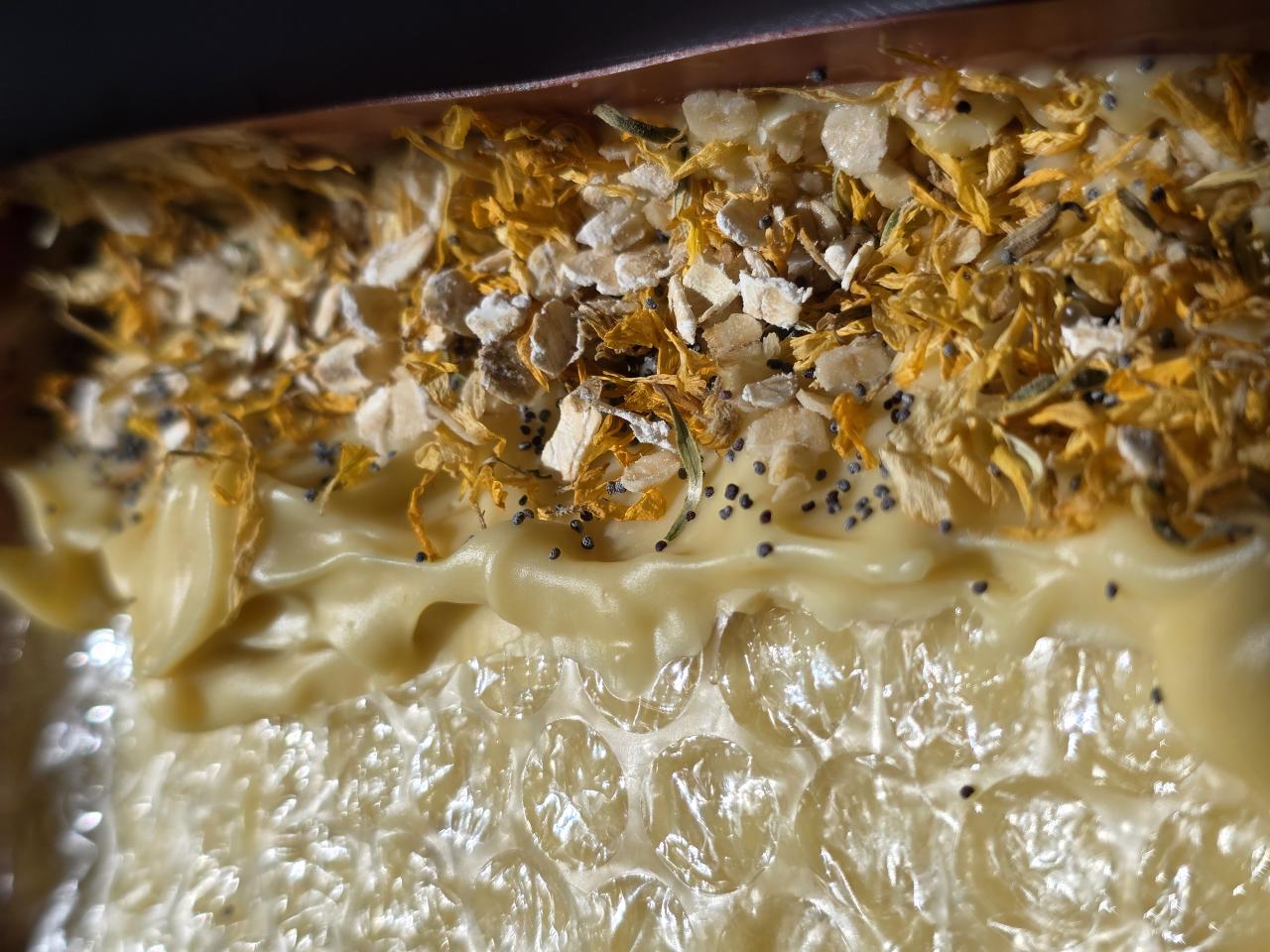 Ingrédients : Macérat de calendula* sur huile d'olive*, lait d'avoine* (fabrication artisanale) beurre de karité bio*, huile de noix de coco bio, beurre de cacao bio, huile de ricin bio, parfum "miel avoine", cire d'abeille*, miel*, poudre d'avoine*. Fleurs de calendula et graines de moutarde* et pavot*.