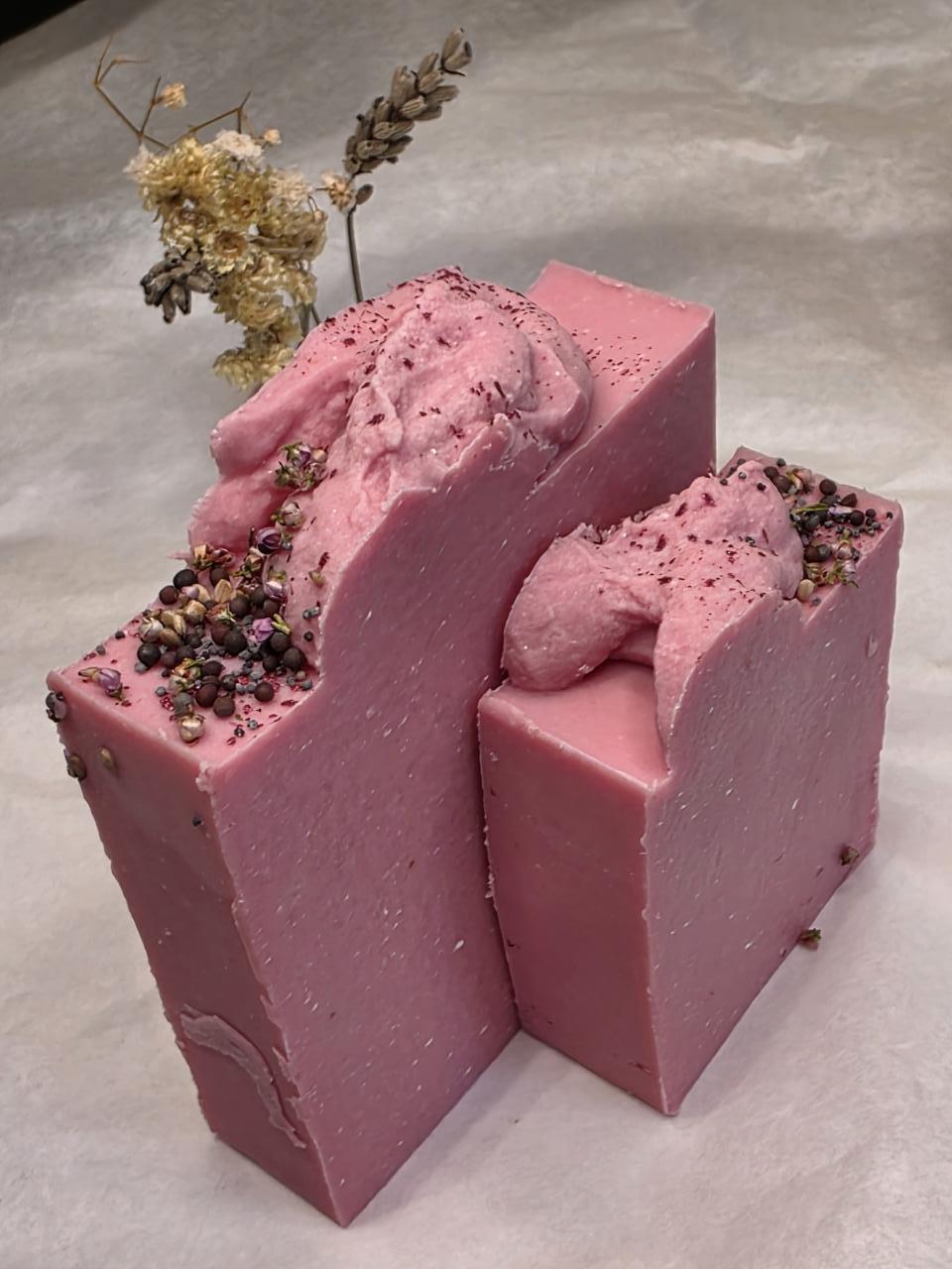 Ingrédients : beurre de karité*, lait de chèvre, huile végétale noix de coco*, macérat de fleurs de bleuets sur huile de tournesol*,beurre de cacao*, huile de ricin*, parfum "rose", miel toutes fleurs*, argile rose, fleurs de bruyère, de graines de moutarde* et pavot*.
