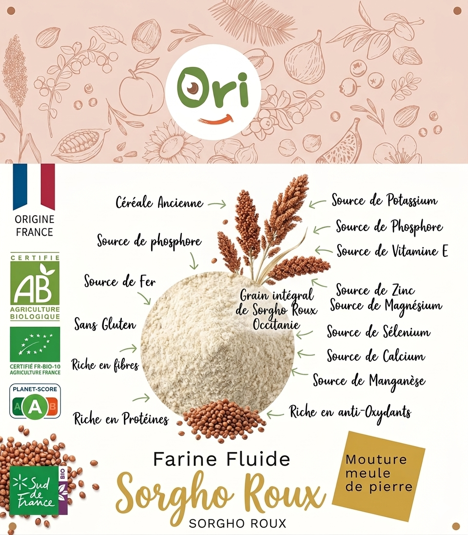 ORI vous offre une expérience culinaire unique avec une farine fluide du Sorgho Roux Occitan / Français.