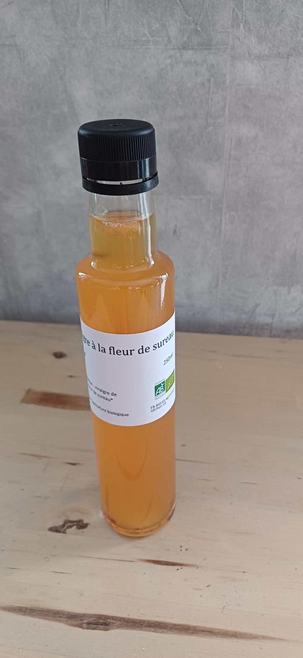 Vinaigre de cidre infusé avec des fleurs de sureau bio de la région évidemment. A utiliser dans toutes vos vinaigrettes pour vos salades ou crudités diverses. Apporte une note floral