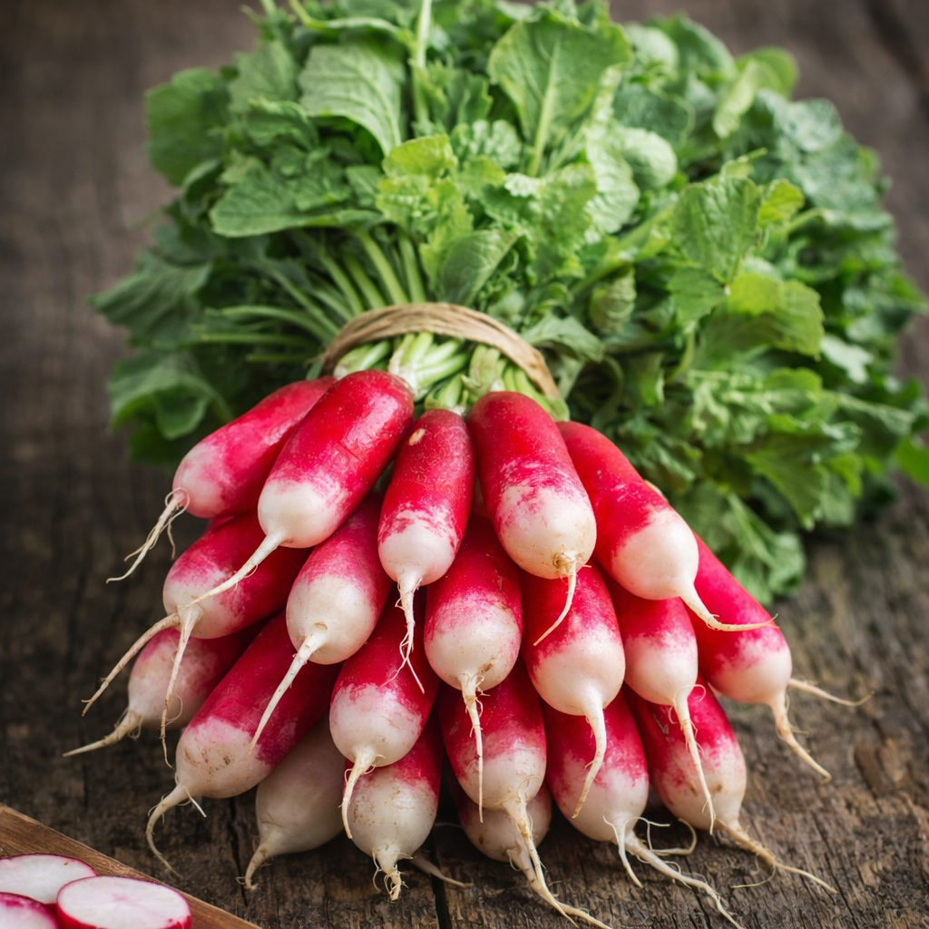 Radis frais et croquants, vendus en botte avec leurs fanes. Idéals à déguster crus avec du beurre et du sel ou en salade. Riche en fraîcheur et en vitamines.