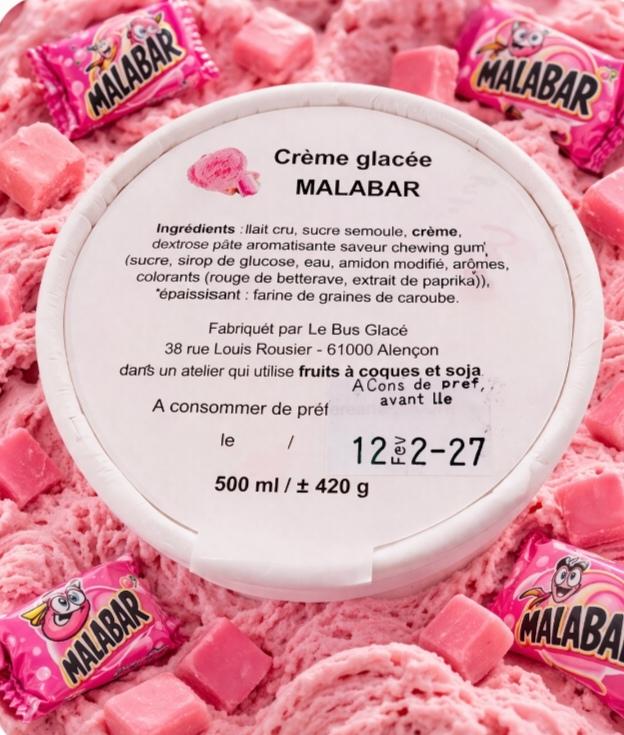 Surgelé Allergènes : Lait, Créme, Durée de conservation : 16 mois Ingrédients : Lait cru, sucre semoule, crème, dextrose, pâte aromatisante saveur chewing gum(sucre,sirop de glucose,eau, amidon modifié, arômes, colorants(rouge de betterave, extrait de paprika)), épaississant : farine de graines de caroube.