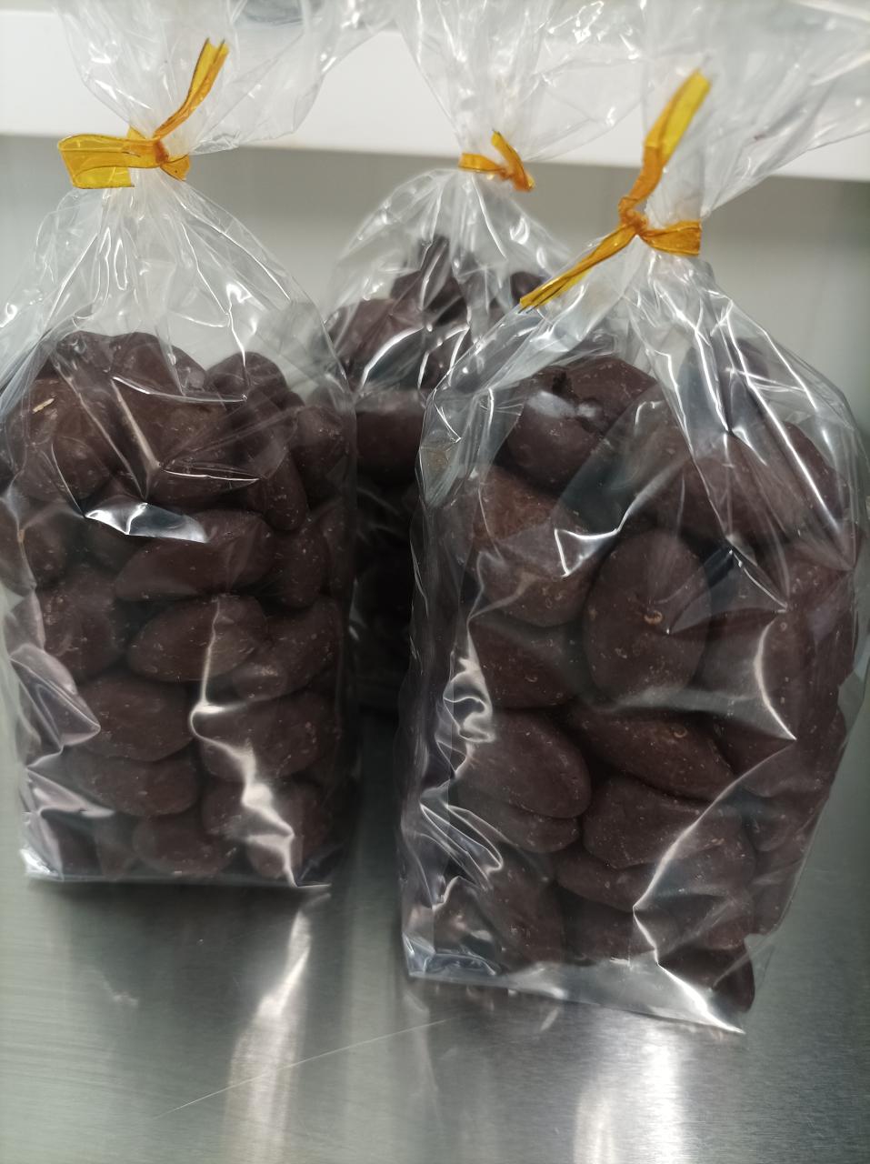 Fruits secs enrobés de chocolat noir, fabrication artisanale.