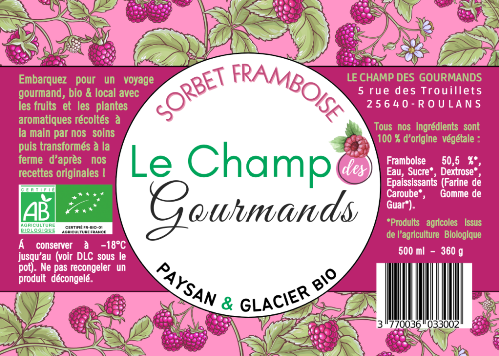Surgelé Conditionnement : Pot 500ml Durée de conservation : 1 an Ingrédients : Pulpe de framboise*, Sucre*, Dextrose*, Épaississants (farine de caroube*, gomme de guar*).