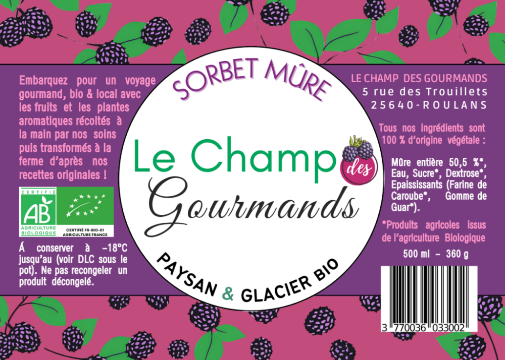 Surgelé Conditionnement : Pot 500ml Durée de conservation : 1 an Ingrédients : Pulpe de mûre*, Sucre*, Dextrose*, Épaississants (farine de caroube*, gomme de guar*).