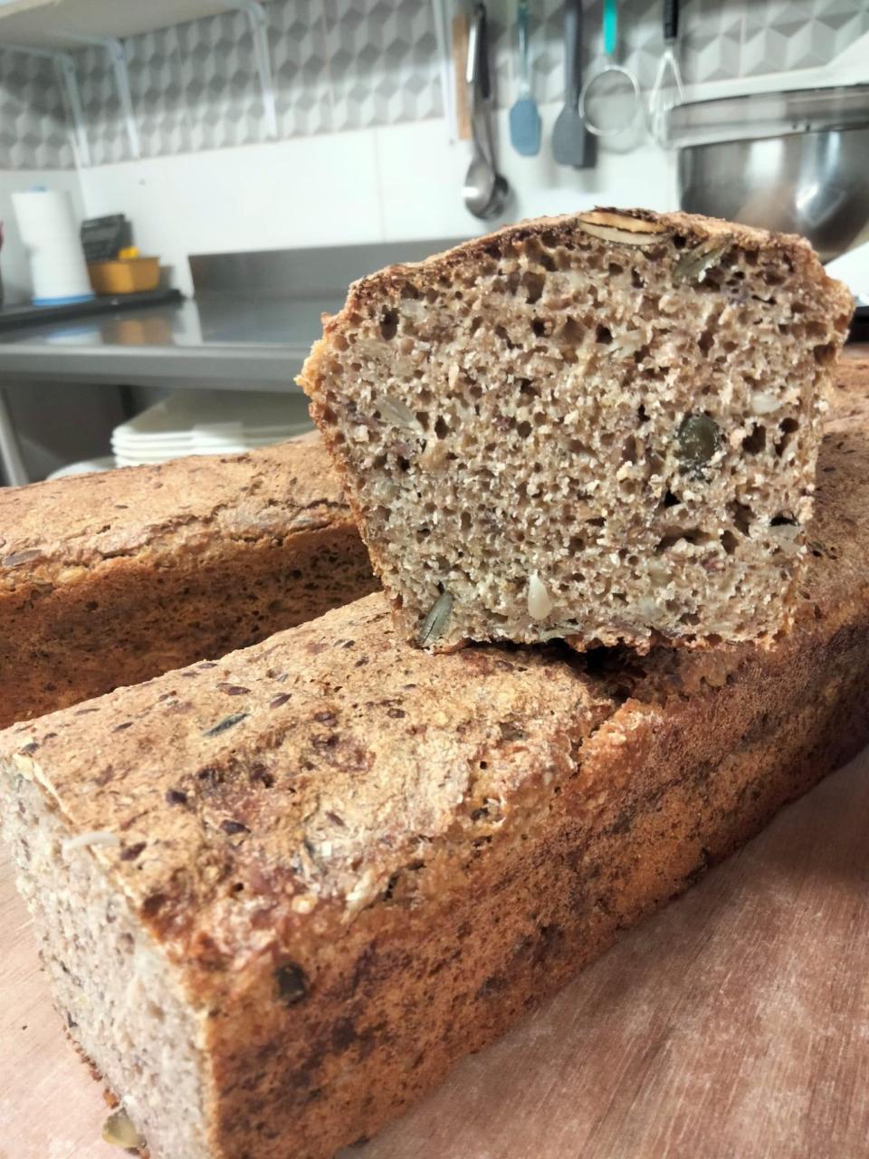 Pain nourricier au levain naturel de blé, farines de blé, seigle, lentilles vertes et pois chiches. Graines de lin, tournesol et courges.