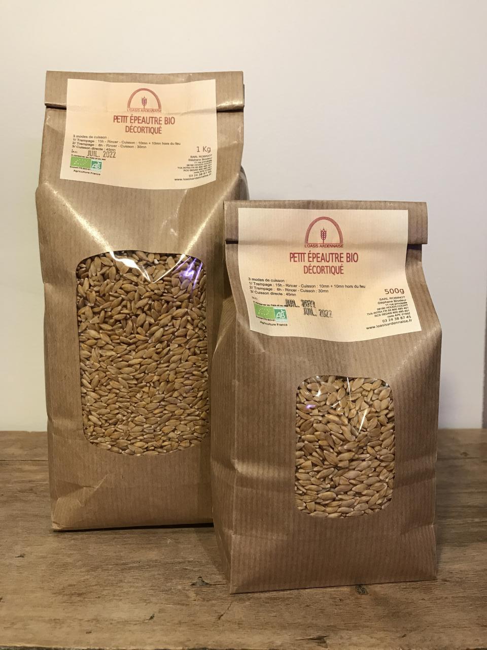 Allergènes : Gluten Conditionnement : sachets de 1kg Durée de conservation : 36 mois à partir de la date de fabrication (DLUO sur l'emballage) Ingrédients : Petit épeautre BIO Colorants ou arômes : 0 Origine : Houdilcourt 08190