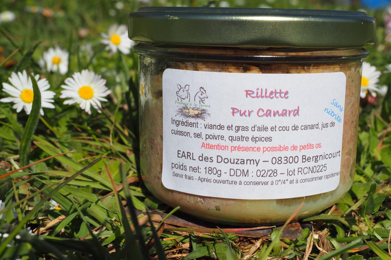 Bocal de 180g de rillette de canard nature transformé et stérilisé à la ferme.