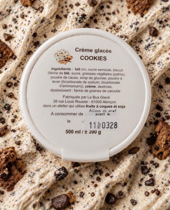 Surgelé Allergènes : Lait, Créme,Blé Durée de conservation : 16 mois Ingrédients : Lait cru, sucre semoule,biscuit (farine de BLE,sucre,graisses végétales(palme),poudre de cacao,sirop de glucose,poudre à lever(bicarbonate de sodium,bicarbonate d'ammonium) ,CREME, dextrose, épaississant : farine de graines de caroube.