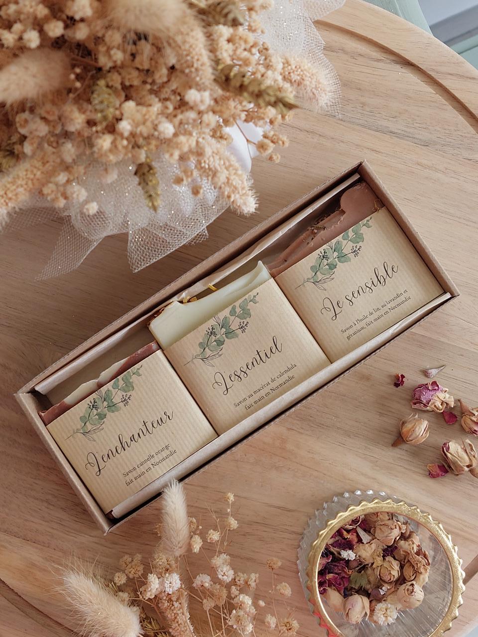 Eveil et sens au naturel a sélectionné pour vous trois savons de 100 g : l'essentiel, l'enchanteur et le sensible.