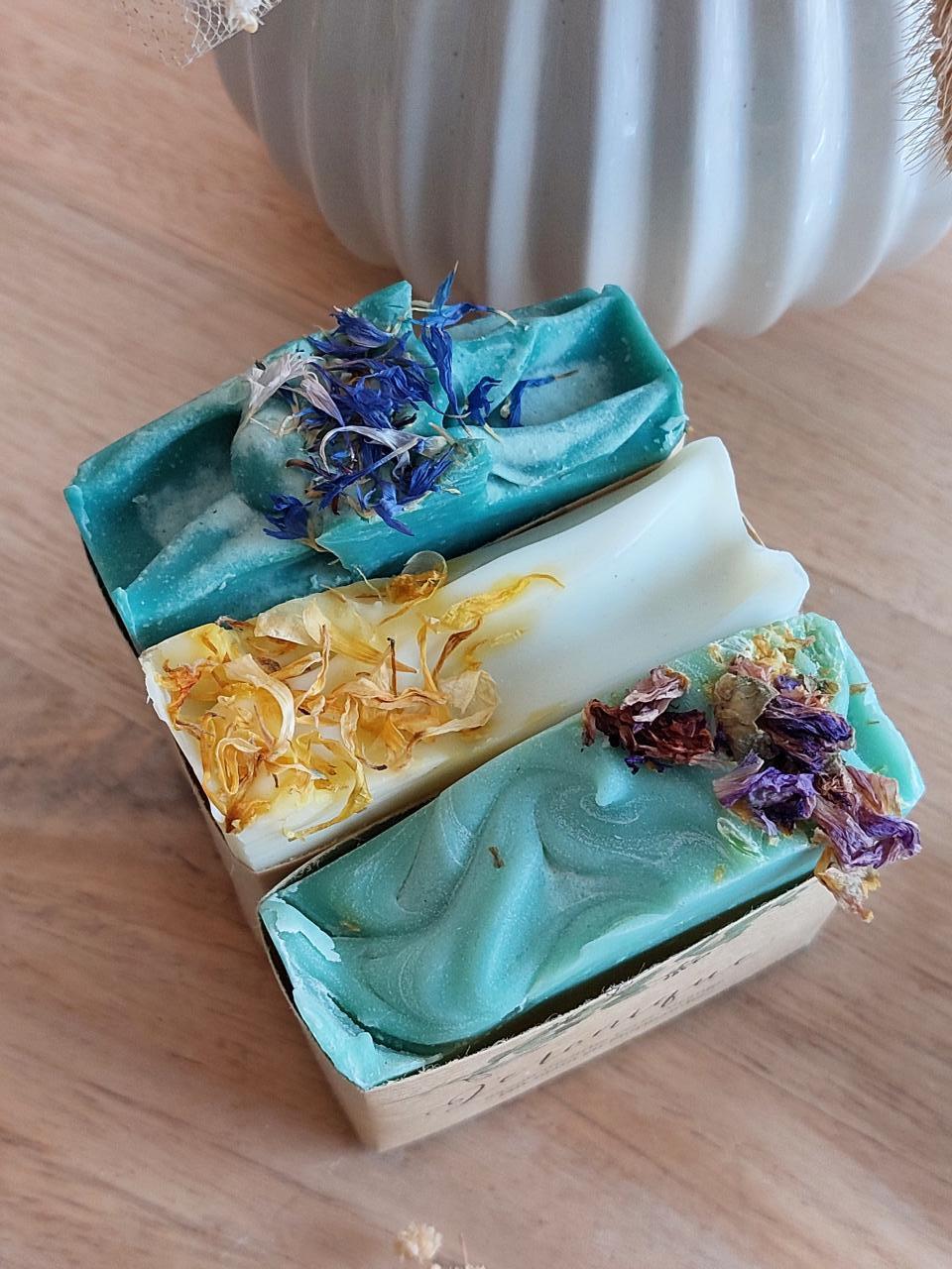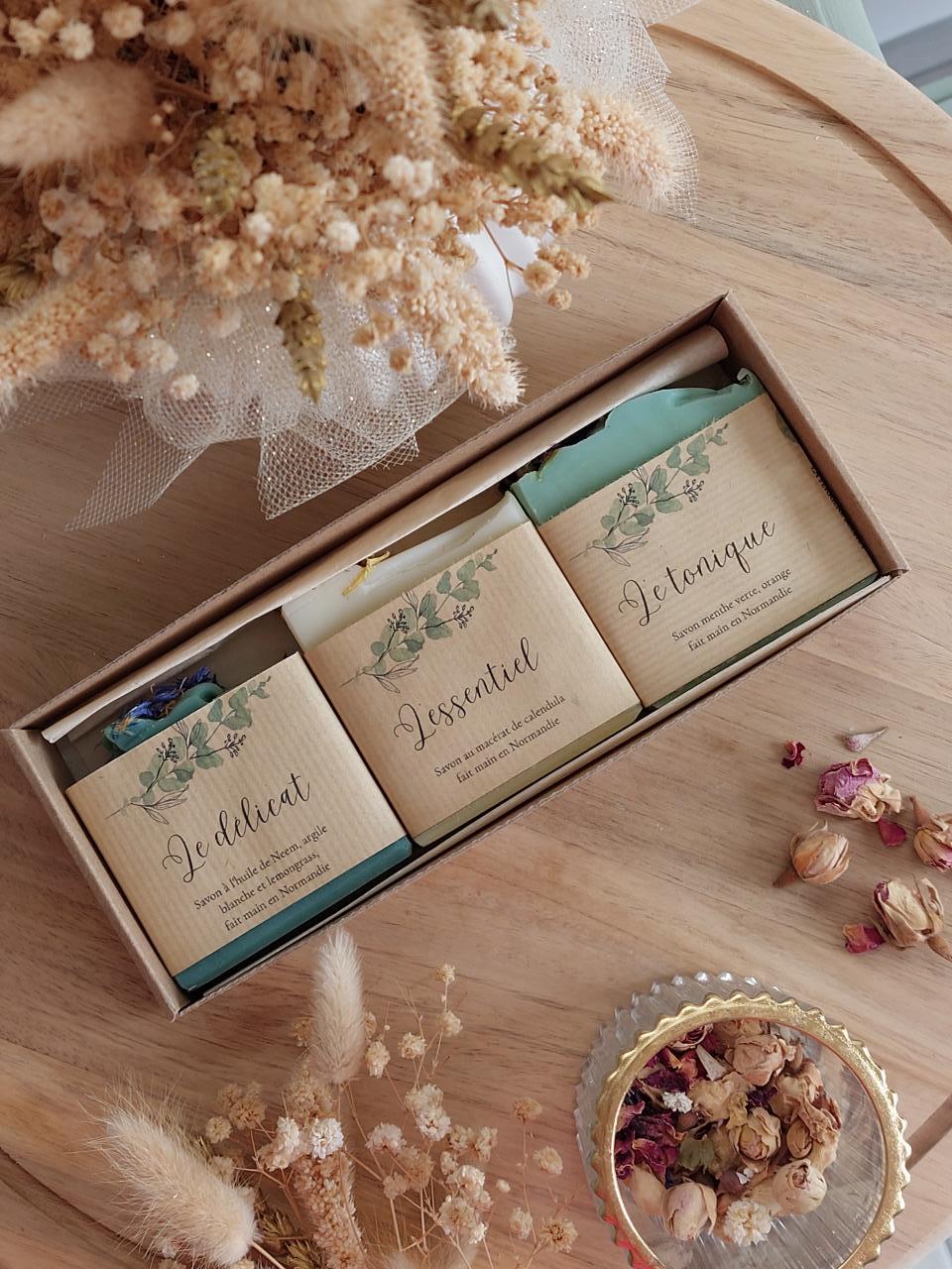 Eveil et sens au naturel a sélectionné pour vous trois savons de 100 g : le tonique, l'essentiel et le délicat.
