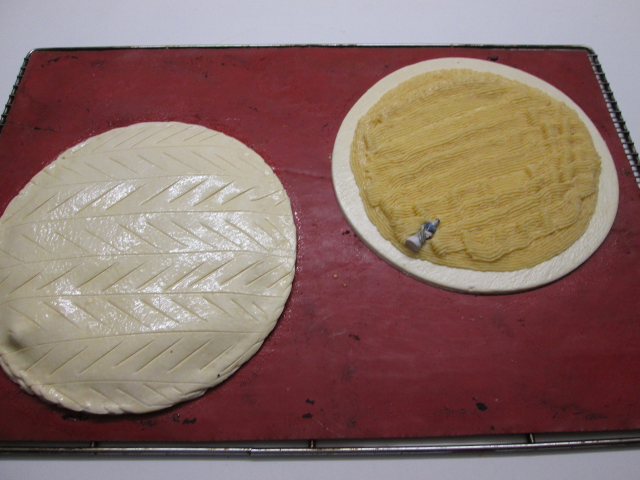 NB: la garniture dite "frangipane" est composé d'un mélange économique crème pâtissière et amande apparue dans les années 80 dans la grande distribution pour proposer un produit peu cher et tout le monde a suivi... malheureusement !!!