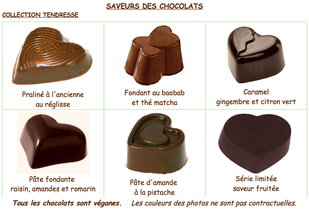 Ballotin "Spécial Saint Valentin" comprenant un assortiment d'une vingtaine de bonbons de chocolats noirs et "lait" dairy free en forme de cœurs fabriqués artisanalement avec du chocolat Bio équitable pur beurre de cacao et des matières premières Bio: