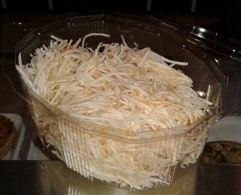 Barquette de céleri cultivé par Nicole et Anicet Poupel à Octeville sur mer. Le céleri est râpé à la demande, le jour de la distribution : ultra frais donc :).