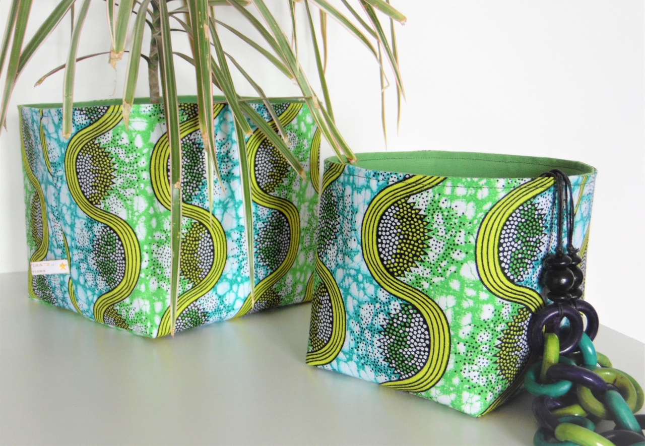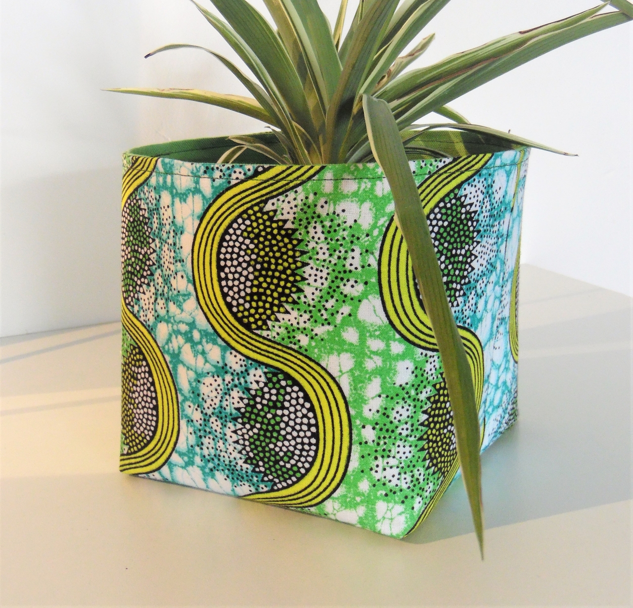 Petit panier de rangement en tissu Wax, de forme carré, doublé de coton mélangé, dans de joyeux tons de vert pomme, jaune citron, turquoise, blanc et noir.