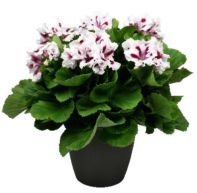 Pélargornium Costa Barcelona White Star (fleurs blanches, coeur bordeau)