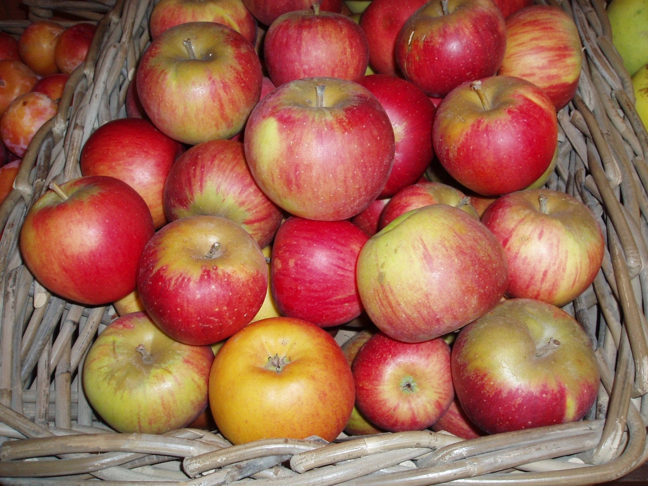 Pomme bicolore, striée rouge et jaune, bien parfumée, une des premières pommes de la saison