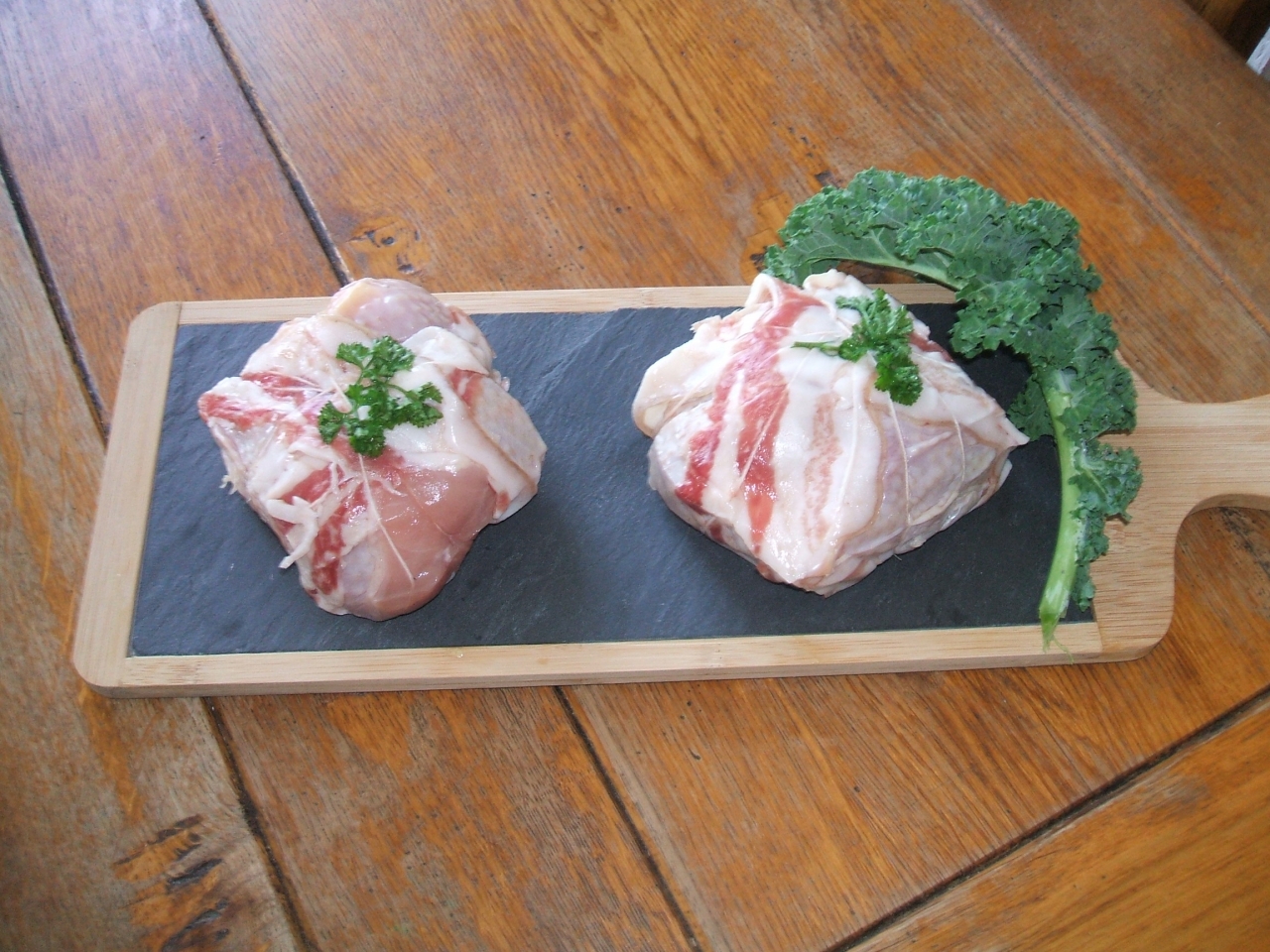 Cuisses de nos poulets farcies de Tomme des Ardennes et Bacon, bardé de lard. Le porc provient des Ardennes et sont élevés sur paille.