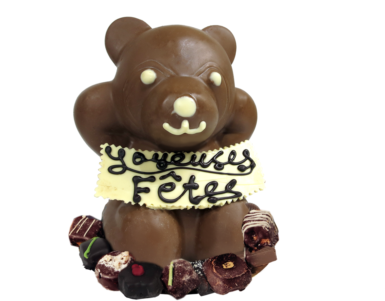 Dans la catégorie « chocolats croquants », découvrez notre attendrissant ourson en chocolat au lait, accompagné d’un assortiment 100% artisanal de ganaches, pralinés, pâtes d’amandes, orangettes et fruits secs enrobés aux trois chocolats. Avec sa banderole de chocolat blanc, il souhaitera de bonnes fêtes à tous !