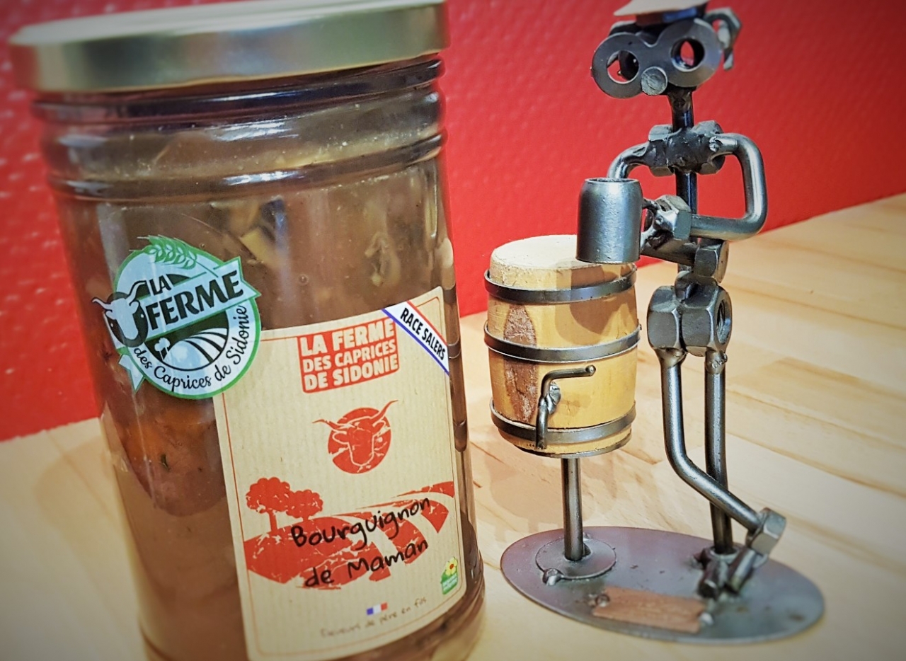 Composition : 45% de viande de Bœuf Salers de notre ferme, lardons, carottes, oignons, champignons, vin rouge, eau, amidon, sel, poivre.