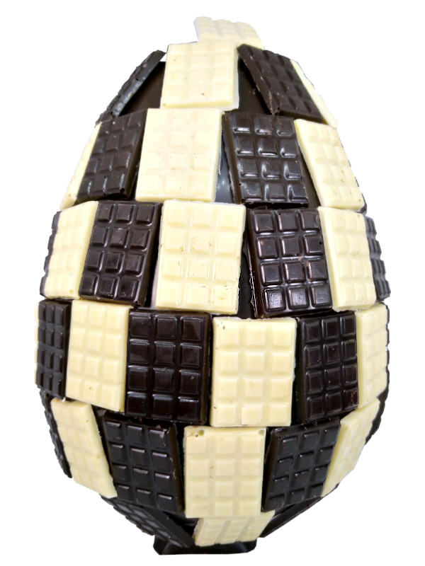 Dans la catégorie « œuf de Pâques insolite », nous décernons la palme à l’œuf contemporain ! Une création noire 72% de cacao décorée de mini tablettes blanches et noires. Très pratique à partager et à déguster, cet oeuf est un vrai régal !