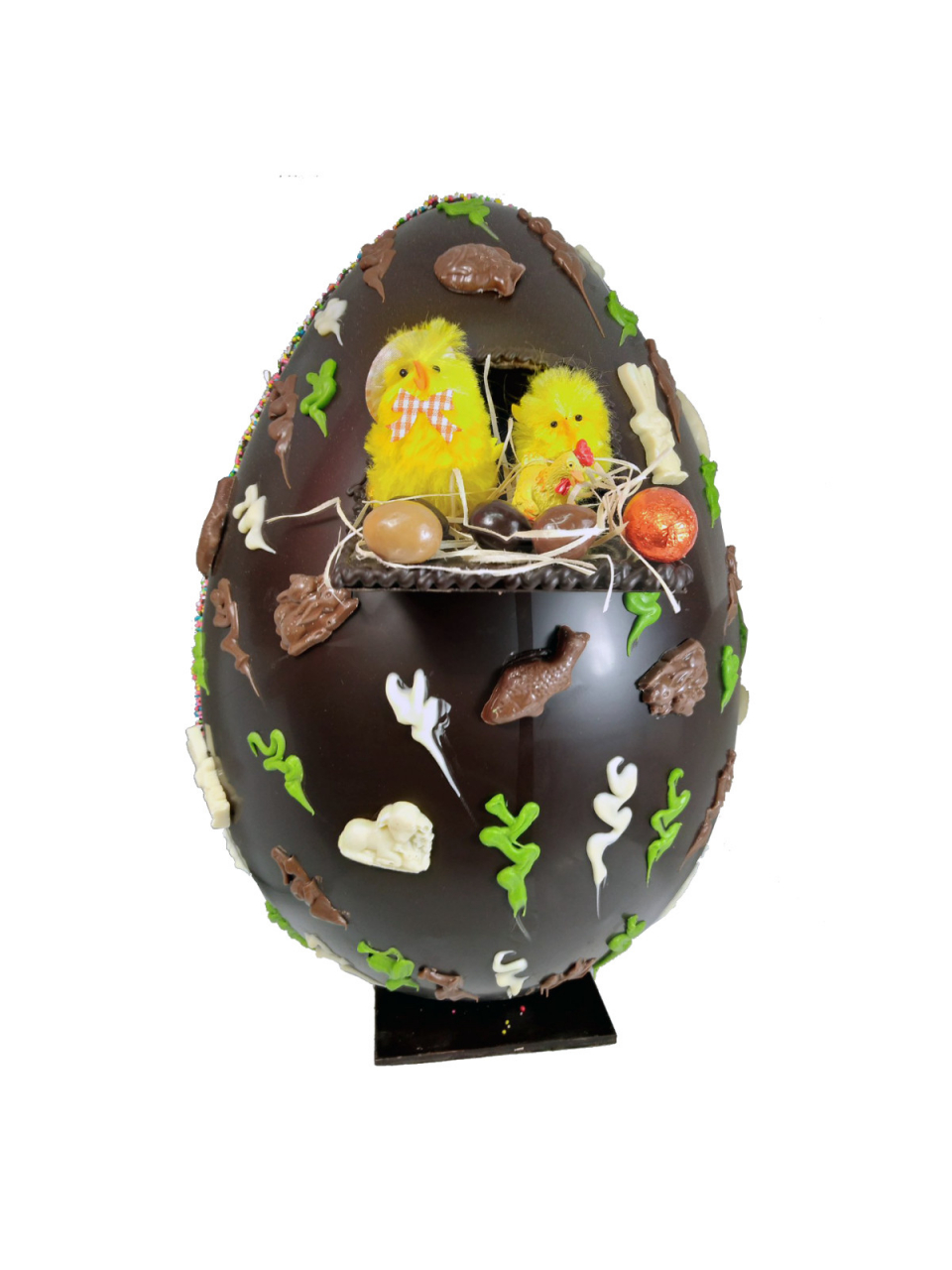 Vos enfants ne rêvent-ils pas de jouer dans un jardin avec trois poules, deux petits lapins et un petit canard ? A Pâques, tout cela devient possible avec cette délicieuse composition de grande taille en chocolat noir 72%. Cet œuf aux motifs colorés de Pâques, sublimera vos tables de fête et donnera vie à la basse-cour tant convoitée de vos petits ! Disponible également au lait.