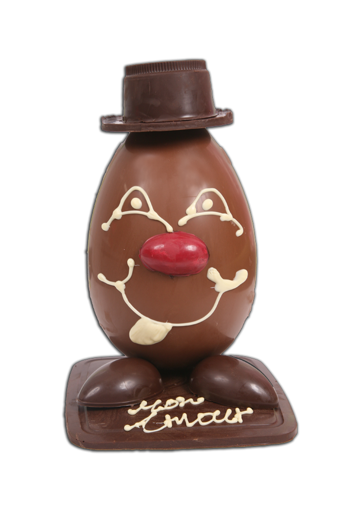 Mesdames et Messieurs, nous avons le plaisir de vous présenter notre mascotte: M. Choco Mon Amour ! Autrement connu sous le nom de M.Patate, cet amusant personnage ravira petits et grands, avec son irrésistible chocolat au lait, ainsi que son chapeau et sa base en chocolat noir. Un retour en enfance incontournable !