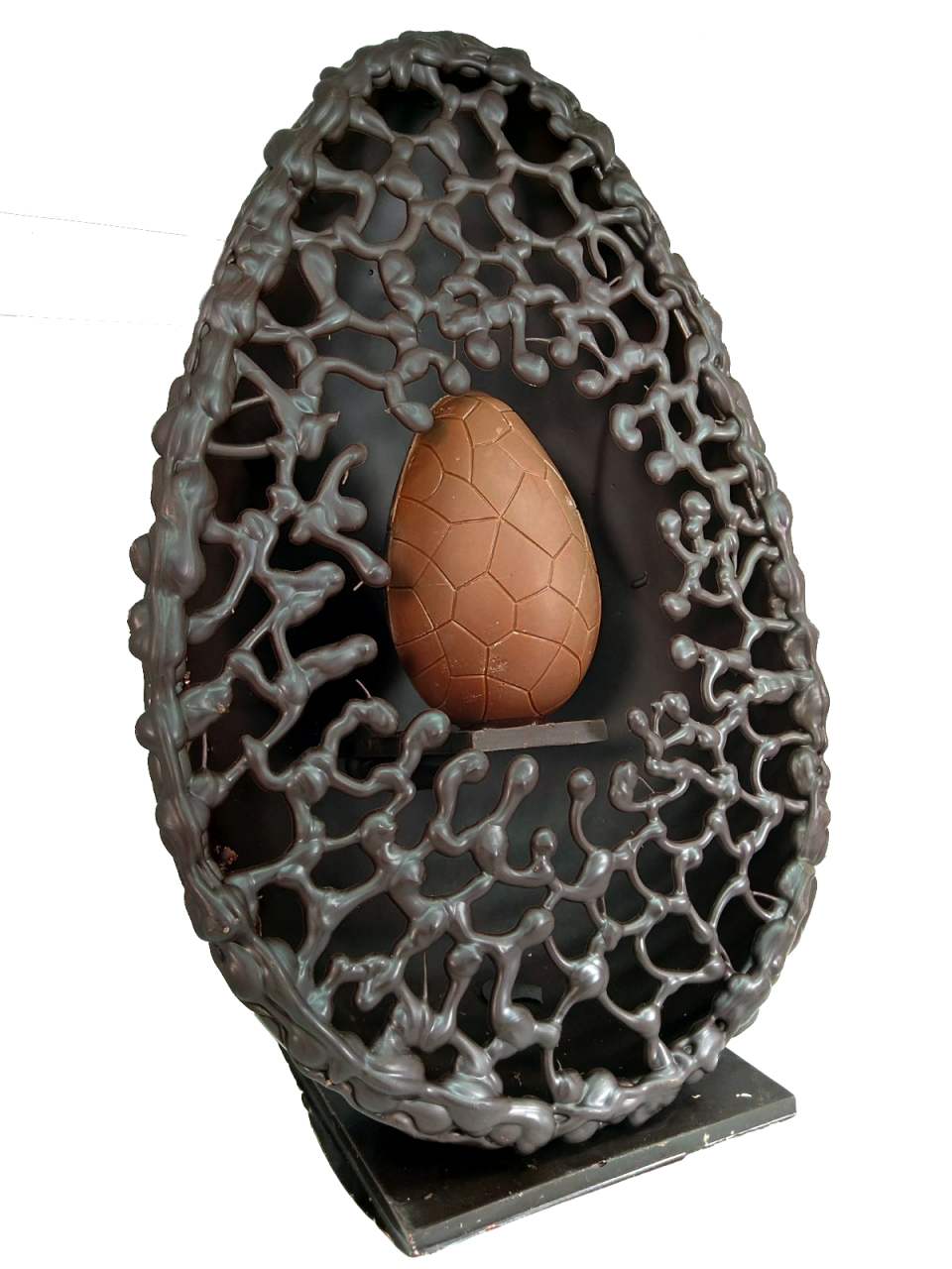 Délicat et fin comme de la dentelle, cet œuf s'adresse à nos sens et à nos émotions. Evadez-vous avec cette approche esthétique et laissez libre court à votre interprétation. Quoi de plus somptueux qu'un bel œuf annonçant l'arrivée de son petit... Un régal palpitant au chocolat noir avec un petit clin d'oeil au lait.