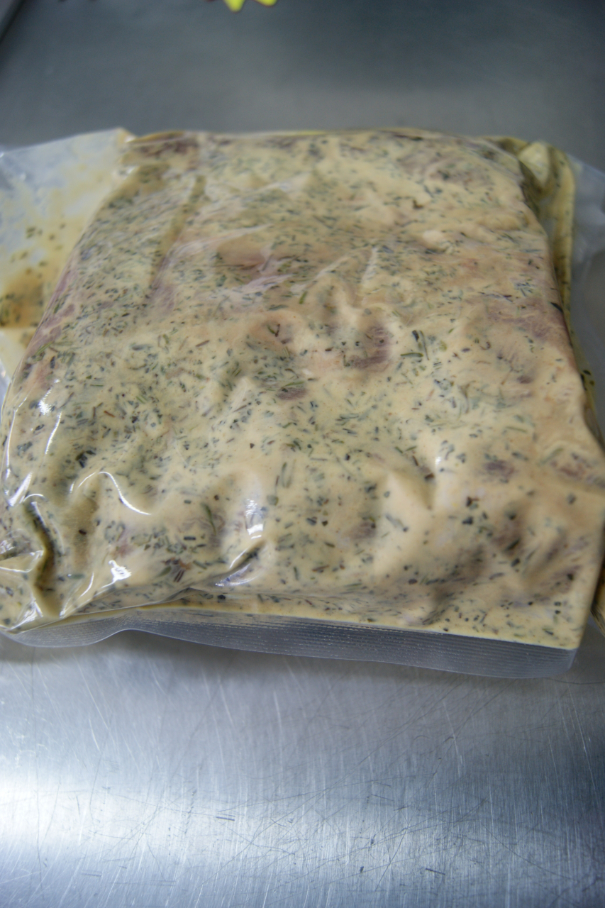 Roti dans le filet l'échine ou la pointe mariné avec moutarde, herbes de Provence...