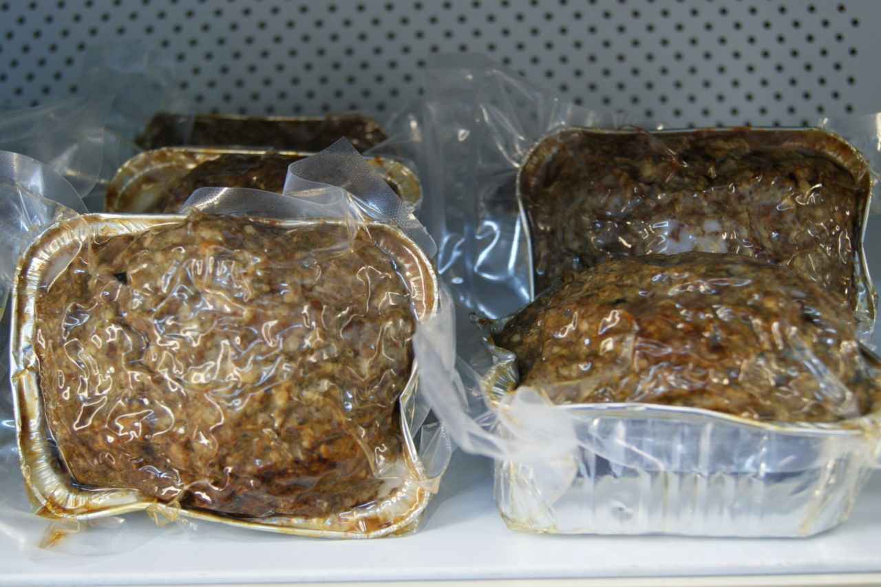 Emballé sous-vide/étiqueté dans son moule de cuisson; pièce de +-500grs.