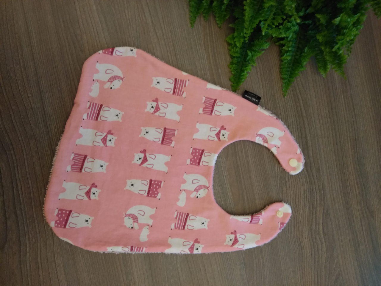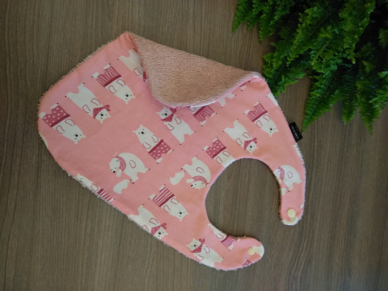 Ce bavoir qui sera votre allié durant les repas est fermé à l'aide d'une pression, il est composé d'un côté en coton et d'un côté en éponge pour le côté absorbant.