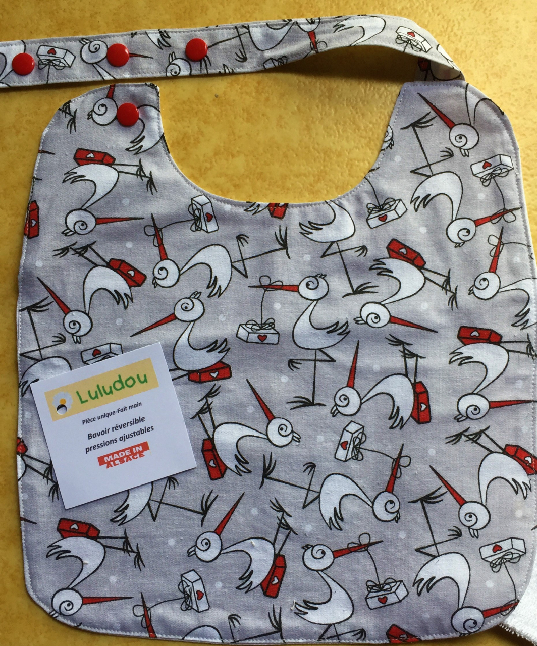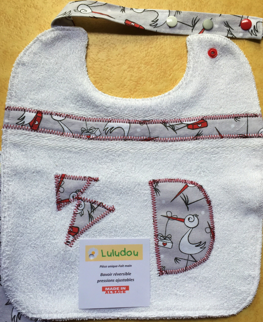 Chaque bavoir est unique, l’envers peut être surpiquée de blanc ou de rouge, la couleur des pressions est différente chaque fois.