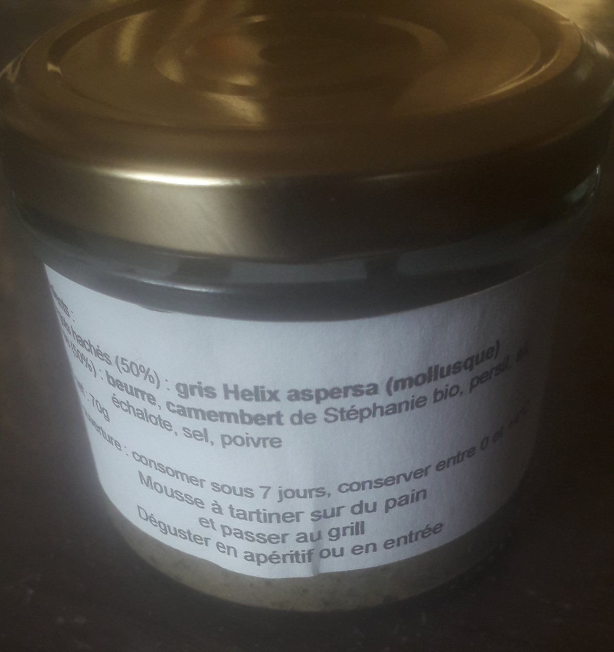 Bocal de 90 gr d'escargotine, une tartinade avec 70% escargots hachés de mon élevage et 30% de persillade au camembert de Normandie issue de l'agriculture biologique "Des Fromages de Stéphanie" de st Leger sur Sarthe.
