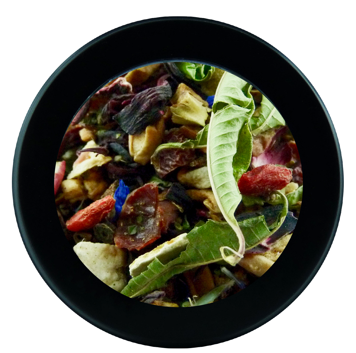 Verveine, hibiscus, anis, menthe, cynorrhodon, écorce d'orange, morceaux de pomme, baie de goji, fleurs de bleuet.