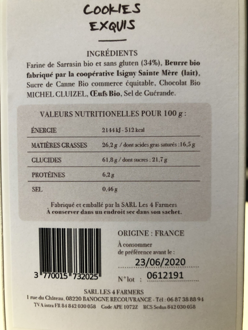 Ces délicieux petits cookies bio et sans gluten ont été fabriqués dans la Biscuiterie de Vincent et Frédérique CONTAL à Banogne Recouvrance dans les Ardennes, en face de leur ferme avec vue sur les champs !