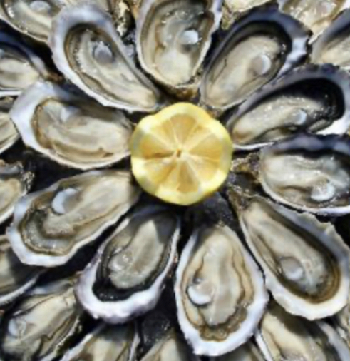Huîtres Marennes Oleron n°3 présentées sur un plateau avec des algues,beurre demi-sel,citron et rince-doigts.
