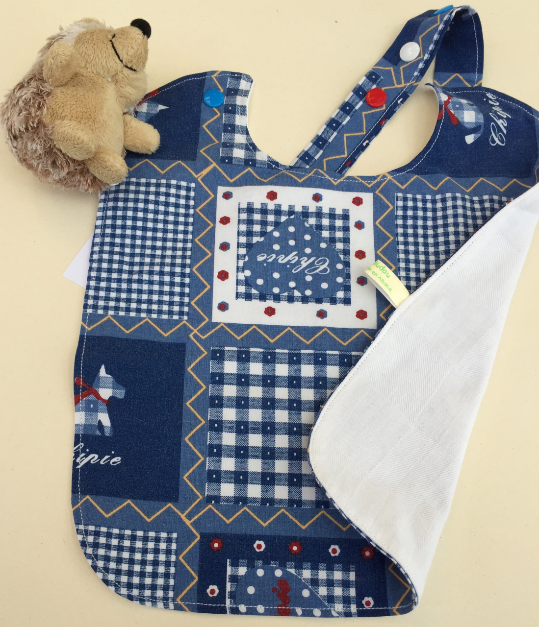 Chaque bavoir est unique, l’envers en nid d’abeille est surpiquée de blanc, les applications sur l’envers ainsi que la couleur des pressions sont différentes sur chaque pièce ; réversible, il peut se porter des 2 côtés.