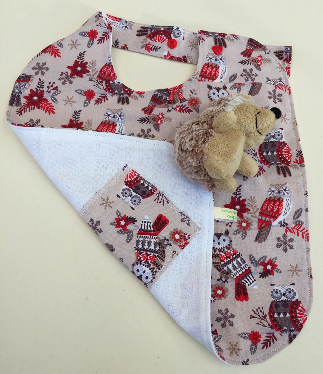 Réalisé en coton Oekotex motif de Noël chouette sur l’endroit, il est doublé de coton molleton blanc décoré du même motif sur l’envers.